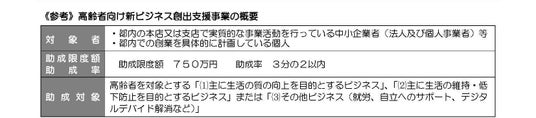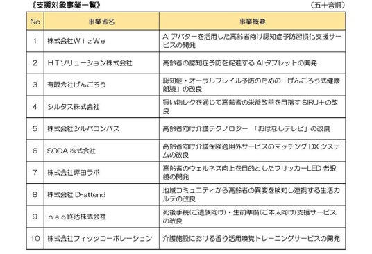 急速な高齢化が進むなか、健康維持、介護、生活支援など、高齢者の多様なニーズに対応する市場が拡大し ています。このような社会背景から、東京都及び(公財)東京都中小企業振興公社は、こうした市場へ事業展 開を図る都内の中小企業者等に対して、高齢者向けの製品やサービスを対象に、開発・改良等を行うために必要な経費の一部を支援する事業を実施しています。この度、対象事業 10 件を決定しましたので、お知らせし ます。