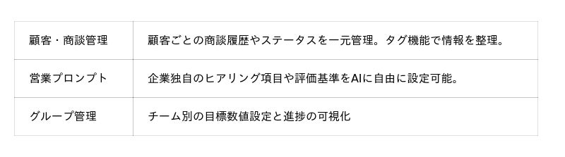 本アップデートにより、商談の録画・分析から、その後の顧客情報の蓄積、KPI進捗の管理までを一つのシステムで完結することが可能になります。さらに、自社独自の営業指標をAIに反映させる「営業プロンプト」機能の実装により、組織全体の営業品質の平準化と管理コストの劇的な削減を支援します。