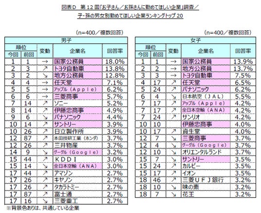 第12回「お子さん/お孫さんに勤めてほしい企業」調査のランキング1位は「国家公務員」(回答率16.0%)となりました。次いで2位「地方公務員」(同13.3%)、3位「トヨタ自動車」(同10.8%)、4位「任天堂」(同6.9%)、5位「パナソニック」(同5.4%)、6位「アップル(Apple)」(同5.3%)、7位「三菱商事」(同4.8%)、8位「伊藤忠商事」(同4.4%)、9位「ソニー」(同4.1%)、10位「日本航空(JAL)」(同3.9%)と続きました。