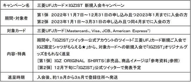 本キャンペーンは「IGZIST」のツイッター公式アカウント(@IGZIST_GG)からの申し込みが対象。期間中、同アカウントのキャンペーン告知ツイートに掲載の専用URLから三菱UFJカードに入会すると、もれなく「IGZIST」オリジナルグッズ(第一弾はシャツ、下表参照)をプレゼントします。