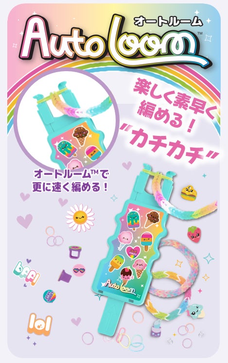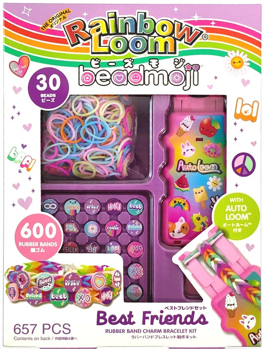 「Auto Loom(R) (オートルーム)」は人気の「Loomi-Pals(R) (ルーミパルズ)」付きと「Beadmoji(R) (ビーズモジ)」付きの2種類パッケージも売り出しております。オートルームで出来上がったブレスレットにルーミパルズのチャームをつけたり、ビーズモジのビーズをつけたりして自分のブレスレットがカスタマイズできます。