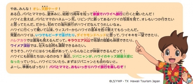 「アロハ!妖怪ウォッチ 楽園ハワイ♪でゲラゲラポー!!」は、(株)レベルファイブ協力のもと、子供に絶大なる人気を誇る妖怪ウォッチとコラボレーションし、ファミリー層やファーストタイマーに向けて、安心して旅行を楽しめるリゾート「ハワイ」を誘致するプロモーション活動で、ハワイがますます楽しくなるキャンペーンを多数実施していきます。
