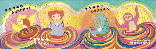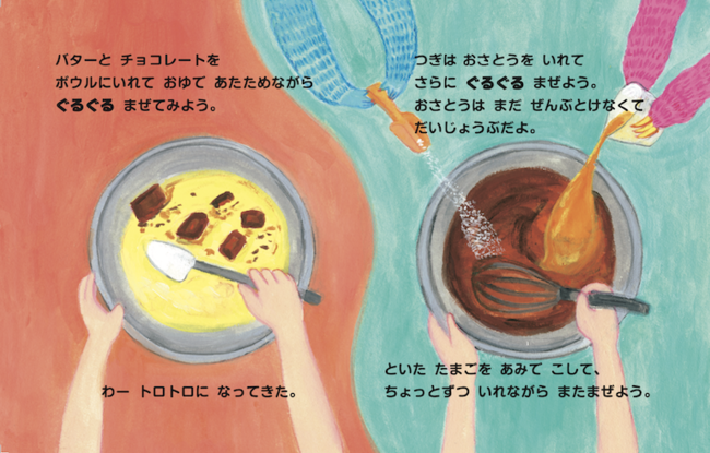 「ぐるぐる」「ぱっかーん」「トロトロ」などオノマトペを取り入れ、子供が耳で聞いて楽しめる工夫をしています。