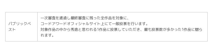 詳細は、オフィシャルサイトの応募要項(http://www.codeaward.jp/terms/)をご覧ください。