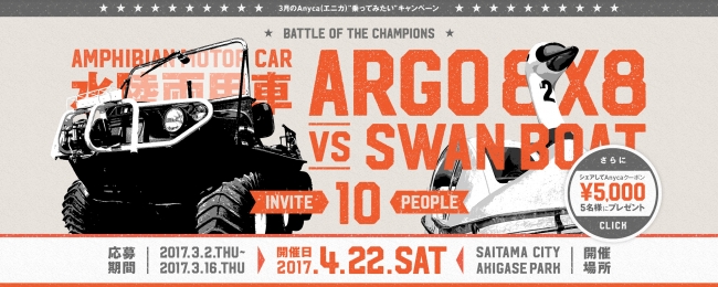 当選した方は、2017年4月22日(土)に秋ヶ瀬公園(埼玉県さいたま市)で、ARGO 8x8もしくはスワンボートに試乗できます。