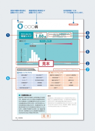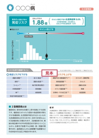 検査レポートブックは「MYCODEヘルスケア」の検査結果のうち、最大26項目の主要な病気[D1] について冊子でお届けするものです。パソコンやスマートフォンがなくてもいつでも結果が確認で、気になる部分に書き込みができるなど、紙ならではの特性を活かしてご利用頂けます。なお、冊子内には各病気の予防につながるキーワードを開設した、冊子オリジナルのコンテンツも用意しています。