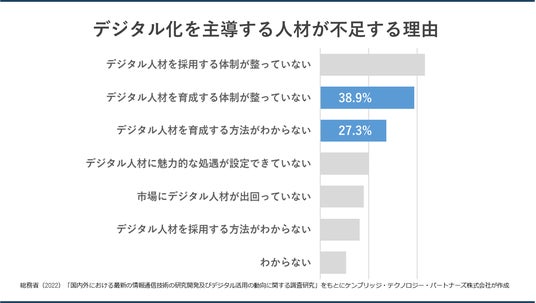 人材不足の理由として、「育成する体制が整っていない」、「育成する方法がわからない」の割合が多いことから(図2)、日本企業の多くがデジタル人材の育成に苦慮していることがわかります。