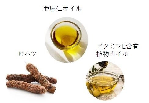 継続的なキレイをサポートする副成分として、オメガ3系の必須脂肪酸α-リノレン酸を豊富に含む国内製造の「亜麻仁オイル」、古くからアーユルヴェーダなどでも珍重されてきた巡りスパイス「ヒハツ」に加え、一般的な酸化防止剤である化合物を使用せず、美容にうれしい植物性の「ビタミンE(d-αトコフェロール)含有オイル」を贅沢に配合。