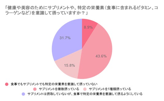 栄養部分にフォーカスし、さらに深掘りして伺ったところ、「健康や美容のためにサプリメントや、特定の栄養素(食事に含まれるビタミン、コラーゲンなど)を意識して摂っていますか?」という問いに対し、「サプリメントを複数摂っている」と回答した人は43.6%、「サプリメントを1種類摂っている」と回答した人が15.8%、「サプリメントは摂取していないが、食事で特定の栄養素を意識して摂るようにしている」と回答した人が31.7%、「食事でもサプリメントでも特定の栄養素を意識して摂っていない」と回答した人は8.9%となりました。