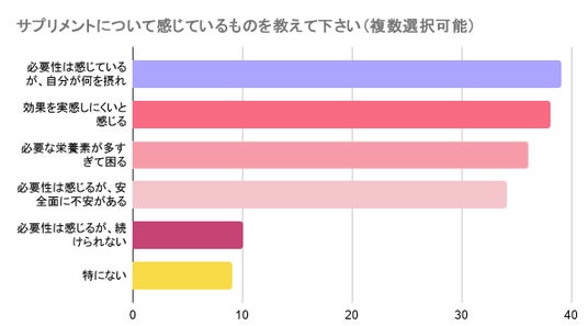 「サプリメントについて感じているものを教えてください(複数選択可能)」という質問に対し、「必要性は感じているが、自分が何を摂ればいいのかわからない」と回答した人が最も多く、39%、次いで、「効果を実感しにくいと感じる」と回答した人は38%、「必要な栄養素が多すぎて困る」と回答した人は36%、「必要性は感じるが、安全面に不安がある」と回答した人は34%、「必要性は感じるが、続けられない」と回答した人が10%、「特にない」と回答した人は9%となりました。