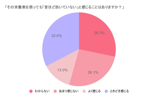 さらに、「その栄養素を摂っても『昔ほど効いていない』と感じることはありますか?」と質問したところ、「よく感じる」13%、「ときどき感じる」32.6%となり、約45%の人は年々効果を感じにくくなっているようです。