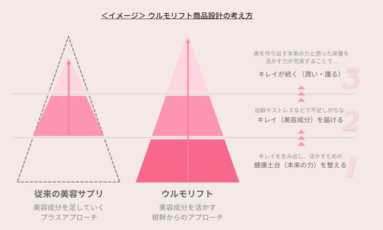 ウルモリフトは「不足を補う」だけでなく、まず内側の土台を整え、“内側からキレイを生み出す力”=キレイサイクルをサポート。栄養を活かし、ハリ・潤いのある前向きな毎日へ導くことを目指しています。