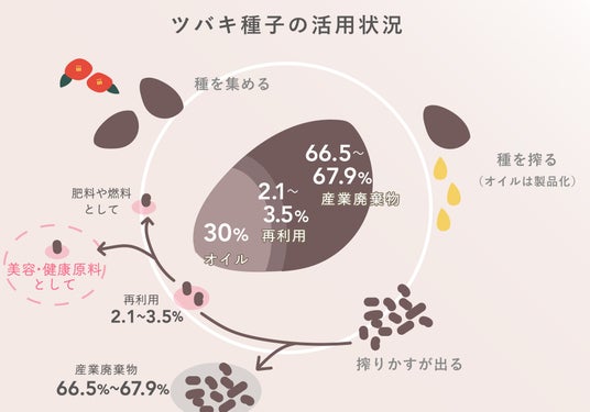 ツバキ油の絞り粕(産業廃棄物)のアップサイクルから生まれたツバキエキス。ツバキの種は3割がオイルとなり、絞り粕として残る7割の部分はこれまでほとんどが産業廃棄物として処理されていましたが、現在ではさまざまな機能や効果が実証され、美容・健康分野での活用が進められています。この搾り粕を有効活用することで、島の持続的な営農や環境維持、島の経済発展へのつながりを目指しています。
