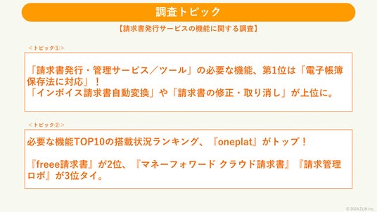 また、現在利用上位10位の請求書発行サービスについて、必要な機能TOP10(11機能)の搭載状況を調査した結果、総合得点で「oneplat」が1位を獲得しました。