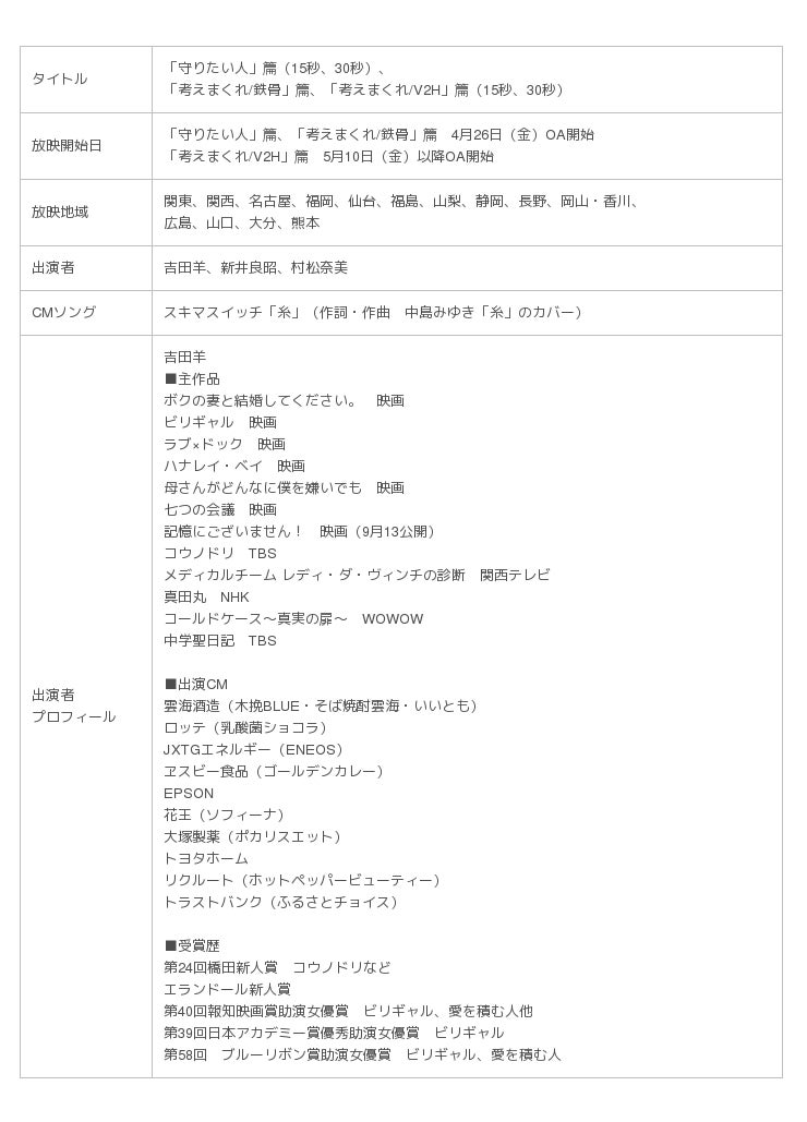 “家族とはどんな存在か”を吉田羊さんが照れながらも、言葉を選んでゆっくり語る姿が印象的な内容になっております。これまで中島みゆきさん(オリジナル曲)、EXILE ATSUSHIさん、Aimerさん、吉岡聖恵さん(いきものがかり)が歌い継いできたCM楽曲「糸」を今回カバーするのは、スキマスイッチさんです。スキマスイッチさんが奏でる新たな「糸」を通して、家族の大切さを紡いでいきます。
