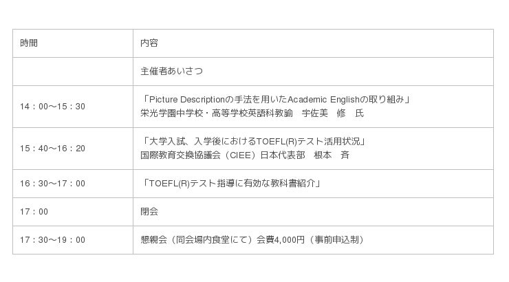 対 象 :TOEFLアライアンスメンバー校教員及び個人会員、英語教員、TOEFL iBTテスト指導者