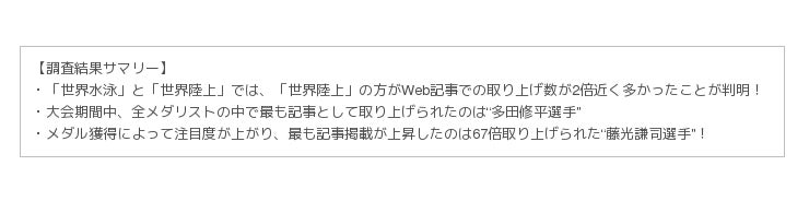 今回の「世界水泳」「世界陸上」でメダルを獲得した日本人は全部で12名いましたが、その中で会期中に最もWeb上で記事にされたのは、参考記録ながら日本人で初めて9秒台を弾き出し、陸上界のシンデレラボーイとして注目度が急激に上昇していた多田修平選手でした。これは、今回の対象選手中、今大会2つのメダルを獲得した瀬戸大也選手(調査期間中の掲載数2位)よりも約200件多い数値でした。
