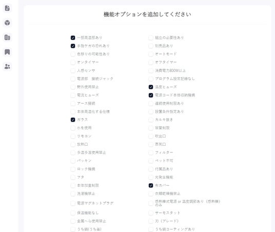 カテゴリから仕様も自動作成し、法的記載漏れを防止
