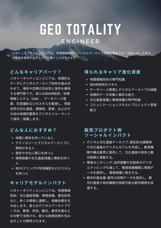 多彩なビジネス領域で課題解決を支援する株式会社ディレック(東京都品川区、代表取締役:宮本幸一)は、歴史的建造物や特殊な空間の3Dアーカイブ・コンテンツ制作で多くの実績をもつ株式会社exAgent(代表取締役社長:中山智博)と提携し、同社監修のもとで建造物や空間を高精度・高品質にデジタル化し、リアルな3Dモデル(デジタルツイン)データとして簡単に活用できるサービス「可視価・CaSeeCa」を展開しています。さらに、「可視価・CaSeeCa」によって新しい市場が生まれ、新たに生まれてくる職業(キャリアパーツ)として、「ジオトータリティエンジニア」を創出。この革新的なエンジニアリングポジションは、現代のテクノロジーと地理情報システム(GIS)を統合し、地球環境と人間社会の複雑な相互作用を理解しながら、解決するために設計されたキャリアパーツです。