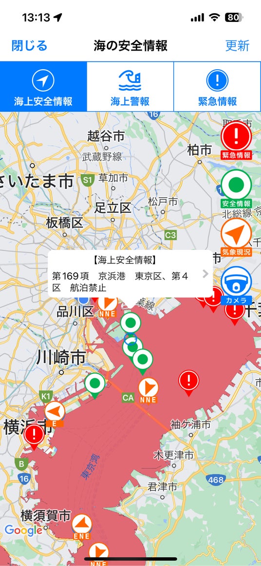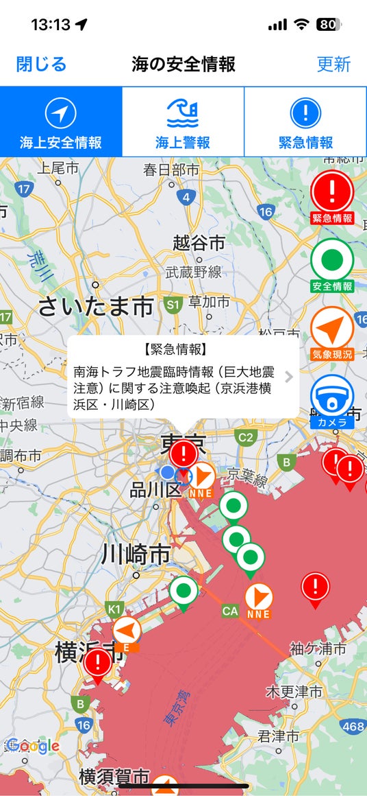 この新機能は、プレジャーボートや遊漁船などの船舶運航者やマリンレジャーの方々に対して、気象庁が発表した海上警報や海上保安庁の海の安全情報を、全国避難所ガイドアプリで確認できるようになりました。