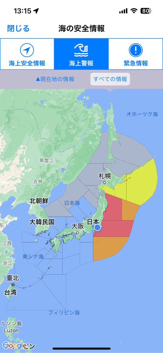 ・現在地海域内の海上警報を、プッシュ通知でお知らせします。