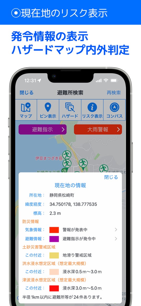 ・GPS機能を利用して、現在地周辺の避難所や避難場所、国民保護避難施設を自動検索