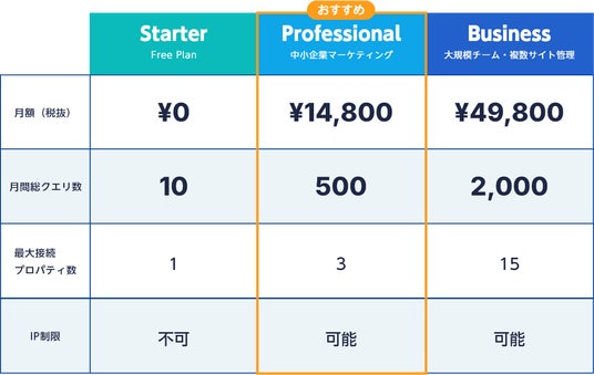月間10回までは無料で質問ができるStarterプラン、コンサルタント、デザイン会社など複数のサイトの状況を分析したい方向けの