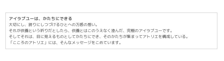 『こころのアトリエ』は、時代のニーズにマッチした“新しい供養のかたち”を提案する、はせがわの「祈りのライフスタイルショップ」です。大切な方への想いをかたちにするご供養はもちろんのこと、日々の暮らしの中に「祈りや願い」を積極的に取り入れるライフスタイルをご提案いたします。