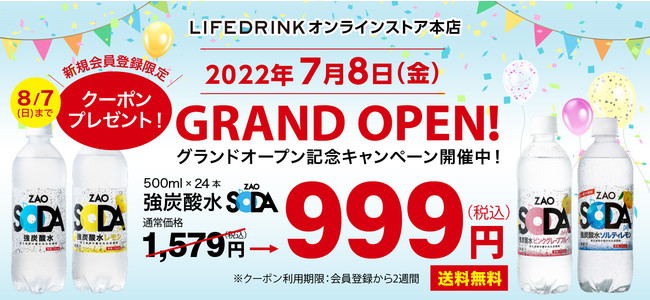 グランドオープンを記念し、新規会員登録された方限定で「LIFEDRINKオンラインストア」人気商品の「ZAO SODA 500ml」購入時に使用できる「580円OFFクーポン」を期間限定でプレゼント!