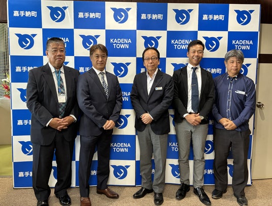 AIカメラ設置の報告に、嘉手納町長 當山 宏様に表敬訪問(中央左:新田代表、中央右:當山町長)