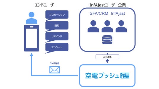 「InfAjast インフアジャスト」と「空電プッシュ」のAPI連携により、顧客向けの連絡手段として、SMSを活用し、プロモーション通知方法の強化ができるようになります。