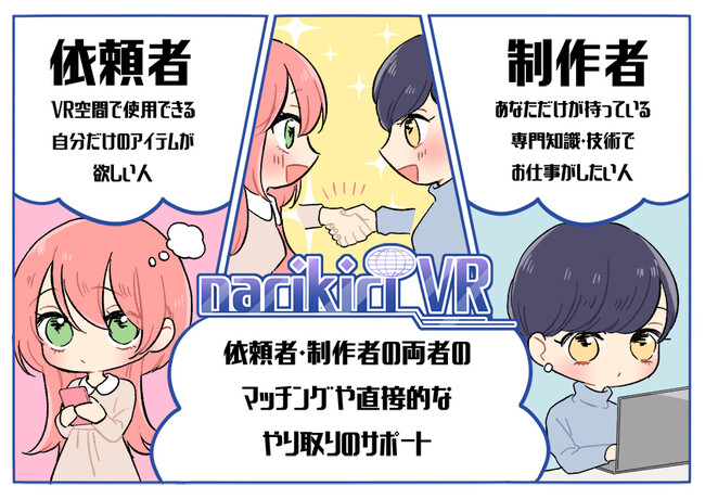株式会社オタクラウド(本社:大阪府大阪市、代表:茶木 盛暢)は、VR空間やメタバース上で利用できる自分だけのオリジナルなアバターや衣装やワールド制作を希望する依頼者とその希望を叶える制作者をマッチングするサービス「narikiri VR」のβ版サービスを開始しました。
