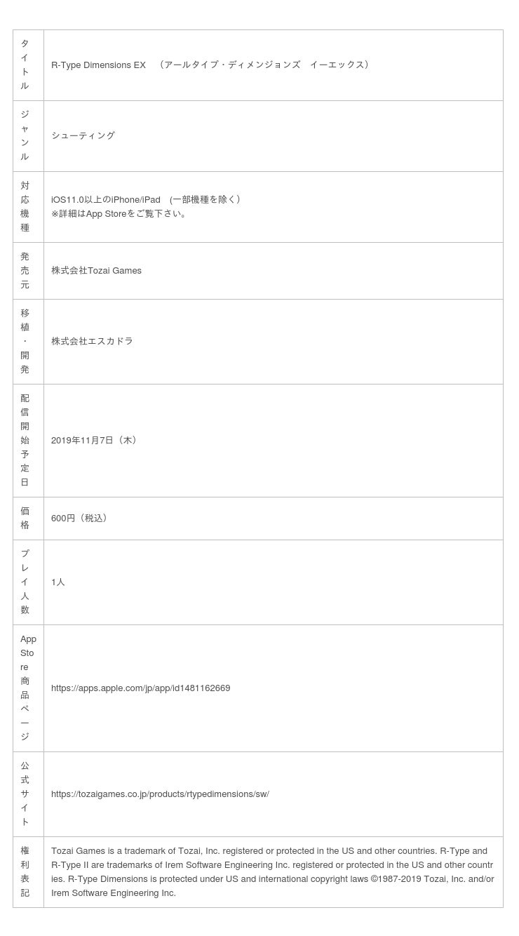 株式会社Tozai Games (神奈川県川崎市、代表取締役: 坂野 拓也、以下、Tozai Games)は、「R-Type Dimensions EX」(アールタイプ・ディメンジョンズ イーエックス)のiOS版を2019年11月7日(木)よりApp Storeを通じて配信を開始致します。