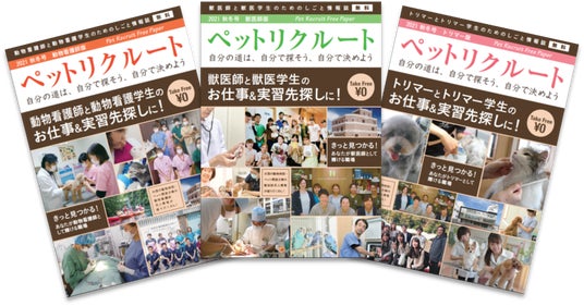 獣医師、動物看護師、トリマー各誌5000部~6000部を発行予定。全国の大学・専門学校の就職課 および研究室、附属動物病院に無料配布!その配布箇所数はなんと、獣医師276箇所、動物看護師184箇所 、トリマー205箇所にもなります。また学校だけではなく、ペットリクルートに登録している求職者の住所にも直接フリーペーパーをお届けします!