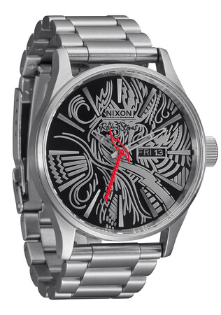 エレガントでエッジの効いたニクソンの代表的な腕時計のSentry Stainless Steelの新バージョンは、ザ・ローリング・ストーンズのディスコグラフィーの中で最も印象的なアルバムカバーの一つであるTattoo Youのアートワークを取り入れたコラボレーションモデル。シルバーとブラックのダイヤルに施されたディテールに、日付表示ウィンドウを備えた、この新しいザ・ローリング・ストーンズのセントリーでロックなスタイルを楽しみましょう。