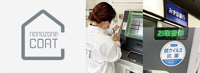 現在ATMなどで使用されているシール状の抗菌剤と共に自己結合性酸化チタン(※)による光触媒コーティング「ナノゾーンコート」がみずほ銀行に導入されました。ATMタッチパネルやオートフォンなど多くの人の手が触れる場所にコーティングを行なっています。