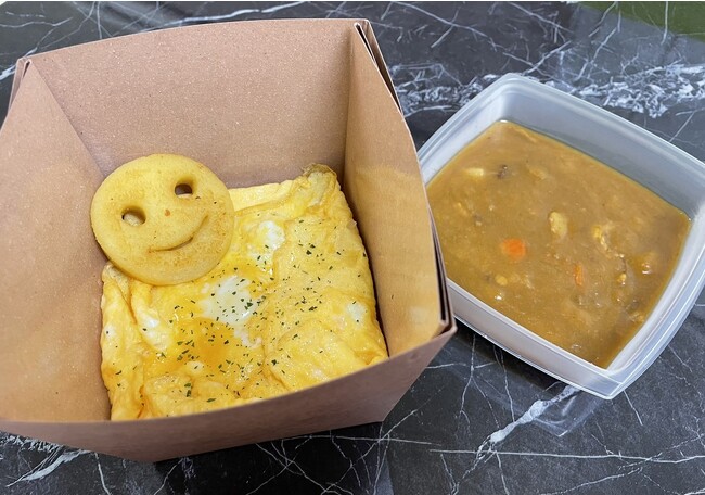 お子様が大好きなオムカレー。少し甘めのカレールーをたっぷりかけてお召し上がりください。野菜もお召し上がりいただけるよう、ご飯にきのこバターを混ぜ込みました。6/21初回のお弁当はこちらをご提供いたします。