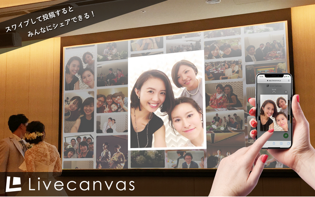 「Livecanvas」は結婚式の披露宴や2次会、パーティや各種イベントにて、参加者が撮った写真や動画をその場でリアルタイムにシェアできるスマホ参加型コンテンツシェアサービスです。