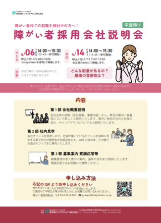 この度、東京都ビジネスサービス(本社:東京都江東区、代表取締役社長:根津史明、以下「当社」)は、障がい者枠での就職を検討されている方を対象とした、4月度の会社説明会を開催することとなりましたので、お知らせいたします。