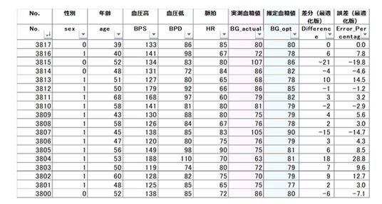 表1 針を使わずに推定した血糖値と実測値の誤差分布(AIによるモデル結果)
