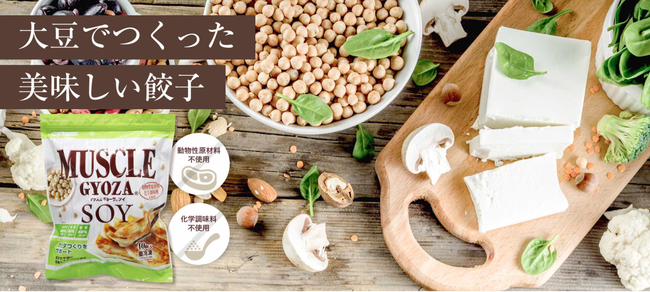 食べるということは、生活のなかで決してなくなることのない楽しいひと時です。ダイエット中の方、ボディメイク中の方、ヴィーガンの方など、その“食べる”という楽しいひと時に制約を持ちながら取り組んでいる方もいらっしゃいます。餃子一筋20年の餃子専門メーカーの技術を結集し、そのような方たちにも食事を楽しんでほしいという想いから開発しました。マッスルギョーザソイでは、大豆ミートと感じさせないよう、食感や味にもこだわり、1年をかけて開発しました。