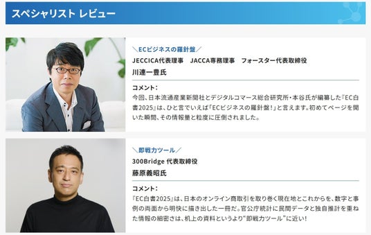 「EC白書2025」購入者には、本資料を制作したデジタルコマース総合研究所の本谷氏や「日本ネット経済新聞」の記者が”ここだけでしか聞けない話”をするオンラインコンテンツを提供します。「EC白書2025」の理解をより深め、データでより詳しくEC市場を理解できるコンテンツを提供します。