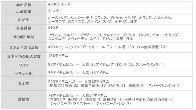 現地パリにて審査を行った日本広報大使を務める友田氏によると、「今年の傾向ですが、日本ワインは、ヨーロッパ品種を使用しながらも繊細さを有するタイプに人気が。また逆に、山葡萄など日本古来の香味特性のあるタイプも高評価です。リキュールはより華やかなタイプが人気。甘口のみならず辛口の評価も高いようです。日本酒は、日本のトレンドと同じフルーティー&ジューシータイプの評価が高いのですが、日本酒らしい繊細さ(淡麗辛口系)もしっかり評価されています。興味深いのは「芋焼酎」の高評価です。焼酎、特に芋焼酎は海外では難しいという認識ですが、実にたくさんの銘柄が入賞し、驚きました。さらに、ジャパニーズ・ジンです。こちらも想定外に高評価が続出。これはいわゆるジャパニーズ・ボタニカルの魅力に高得点がついた結果ではないでしょうか。日本産蒸留酒に期待値大です」