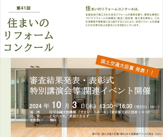 2024年10月3日(木)に「第41回住まいのリフォームコンクール」の審査結果発表・表彰式、関連イベントとして、住宅やリフォームに携わるすべての方に向けた特別講演会、パネルディスカッション(受賞作品講評会)を開催します。