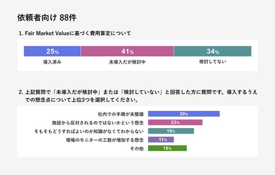 依頼者向けアンケート結果から、FMV導入に対する関心が確実に高まっていることがわかりました。導入済み(25.0%)と未導入だが検討中(40.9%)を合わせると、約3分の2に達しています。一方で、導入に向けた課題としては、「社内での手順が未整備」(56.8%)が最も多く、続いて「施設から反対される懸念」(43.2%)が挙げられました。この結果から、社内準備の整備に加え、施設側への理解促進がFMV導入普及の鍵であることが示されています。