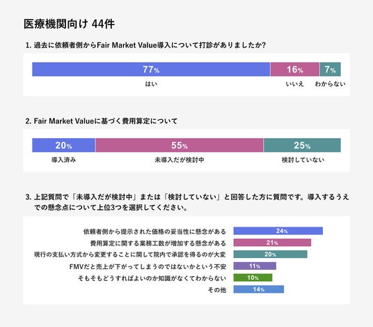 医療機関向けアンケートでは、多くの施設(77.3%)が依頼者からFMV導入の打診を受けている一方、導入済みは20.5%にとどまっています。ただし、検討中の施設が約半数(54.5%)存在するため、今後導入が広がる可能性があることがわかりました。課題としては、「依頼者から提示された価格の妥当性に不安がある」(52.3%)が最も多く、施設側への理解を深める取り組みが重要であることが明らかになりました。また、「費用算定に関する業務工数の増加懸念」(45.5%)も多く挙げられ、効率的な運用設計が求められていることが示されています。