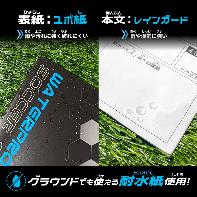 このたび、グラウンドにも持ち込める「耐水サッカーノートA5」が登場!表紙には雨や汚れに強く破れにくいユポ紙を使用し、本文は雨や湿気に強いレインガード素材を使用。表紙、本文ともに耐水機能に優れているため、屋内外場所を問わず使用できます。JFA公認D級コーチライセンス所持者が監修しており、「記憶に残っているプレー」」「意識したこと」「今日の内容」「良かった点、悪かった点、課題」など、項目に沿って振り返ることにより、自身の成長へと繋げることができます。シンプルでわかりやすい内容となっているため、継続して使用することが可能です。