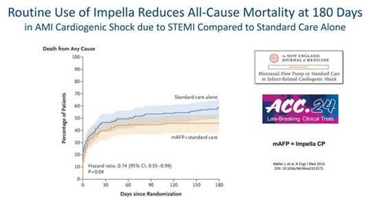 マサチューセッツ州ダンバース 2024年4月7日 - 米国心臓病学会(American College of Cardiology)で発表され、同時にNew England Journal of Medicine誌に掲載された最新の臨床試験において、心原性ショックを合併するST上昇型心筋梗塞(STEMI)患者へのImpella CP使用群が、対照群と比較して180日死亡率を12.7% 低下させたことが確認されました(45.8% 対58.5%、p=0.04)。