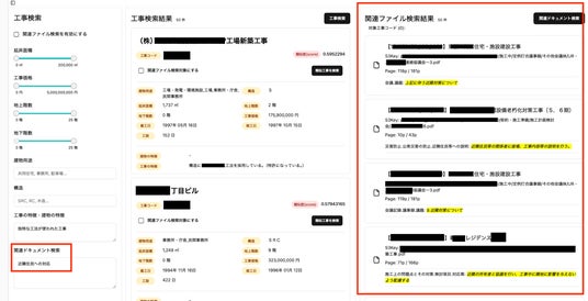 工事情報として約30万レコード、それらに関連するファイル(約330万ファイル、約1億3000万レコード)に対して、自然言語による関連工事とその関連ファイルの検索及び、特定の工事データから類似工事データを検索できるシステムの構築を支援いたしました。