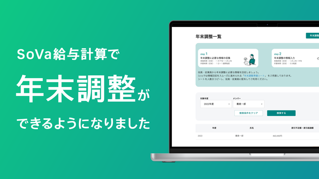 株式会社SoVa(本社:東京都中央区、代表取締役:山本健太郎)が運営するバーチャル会計事務所「SoVa」は、SoVa給与計算内に「年末調整機能」をリリースしたことをお知らせいたします。